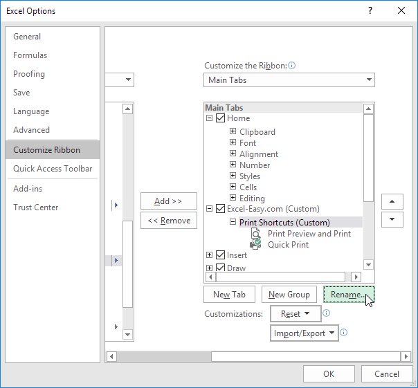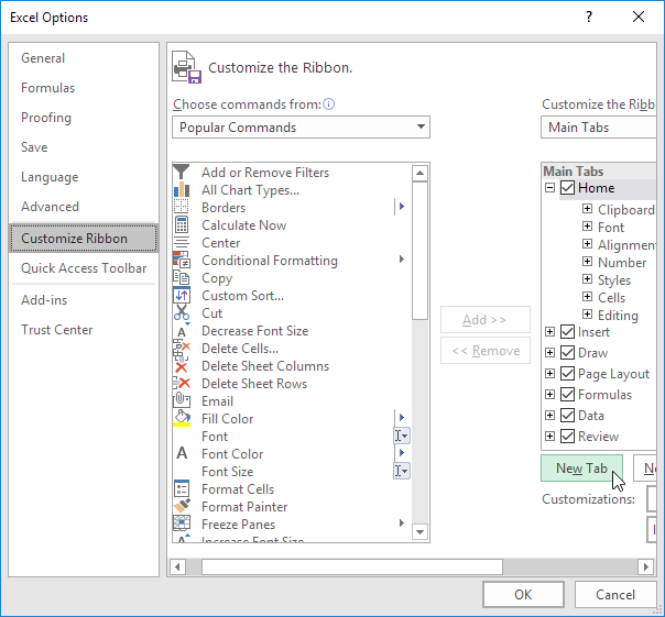 you can also add new groups to existing tabs. To hide a tab, uncheck the corresponding check box. Click Reset, Reset all customizations, to delete all Ribbon and Quick Access Toolbar customizations.